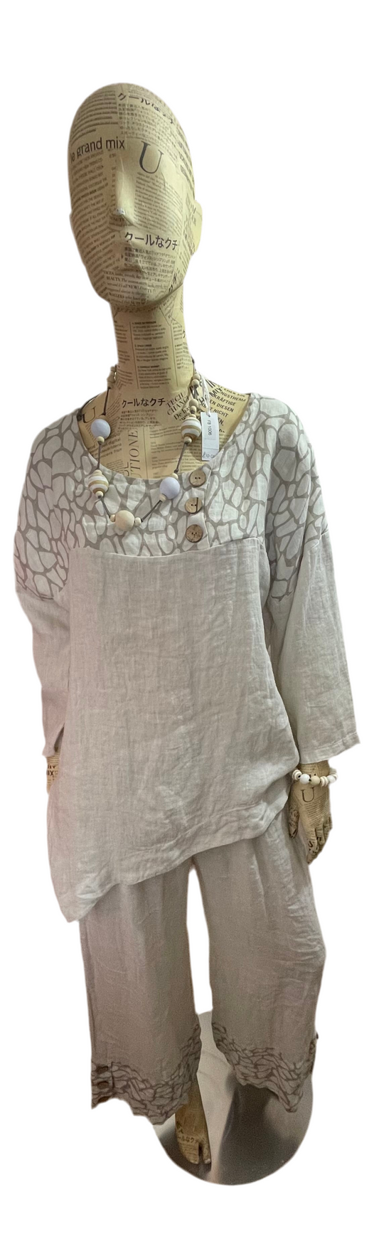 Sarah Tempest linen wide leg trousers with giraffe print hem and coco button detail