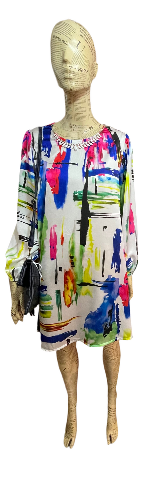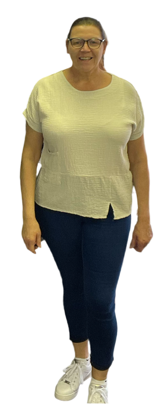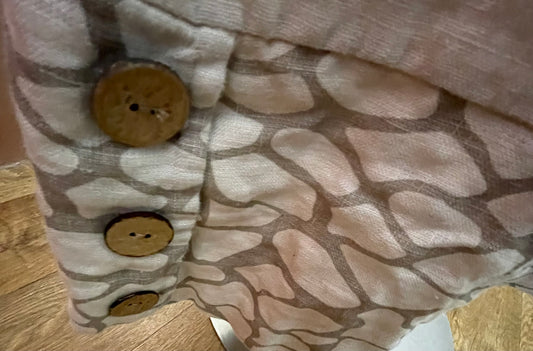 Sarah Tempest asymmetrical linen top with geometric print and coco buttons